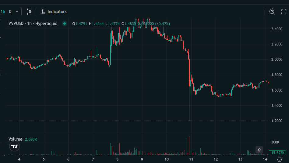 If any VVV holders got liquidated, they might have been using hyperliquid which had a nasty wick down to $1.20, a 48% drop: