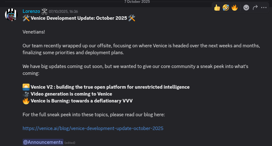 - 🔥 Venice announced a "buyback and burn" scheme starting early November based on October revenue.
