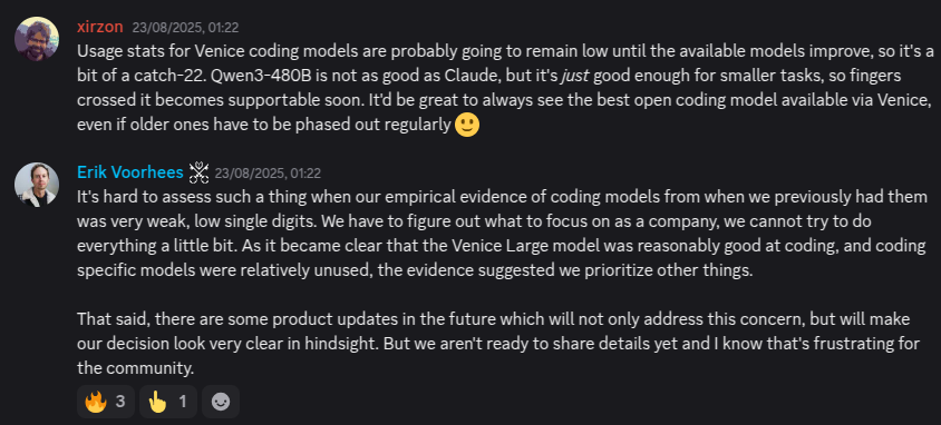 While discussing whether Venice would create a model specifically designed to be good at coding, Erik said:There are some product updates in the future which will not only address this concern, but will make our decision look very clear in hindsight.