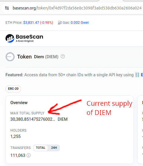 The total Supply of DIEM is 30.38K (source: The DIEM contract address: 0xf4d97f2da56e8c3098f3a8d538db630a2606a024):